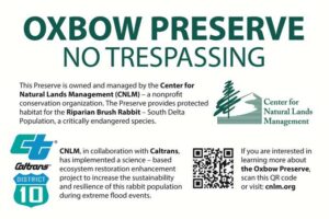 The Oxbow Preserve was initially created in 2004 by Union Pacific Homes as mitigation for the adjacent development in the City of Lathrop. This 30-acre Preserve was established to protect the state and federally endangered riparian brush rabbit (RBR; Sylvilagus bachmani riparius). The Center for Natural Lands Management (CNLM) took ownership of this Preserve in 2004.